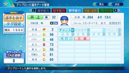この井上で1999年横浜メンバーはラストです 秋元とかも作ろうかと思ったけどまあいらないですよね(再現チームってわけでもないんだし) パワナンバー 12200 61885 89356 代打〇 この年の3本塁打は全て代打、率は.279ですが前年が.415と驚異的な数字 三振、…