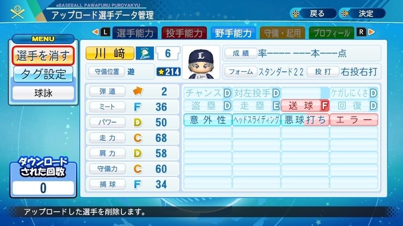 チーム2位の俊足反映でC後半、描写ないけどショートなので肩もD後半、範囲はあるけど雑な守備って印象なので守備C捕球F
