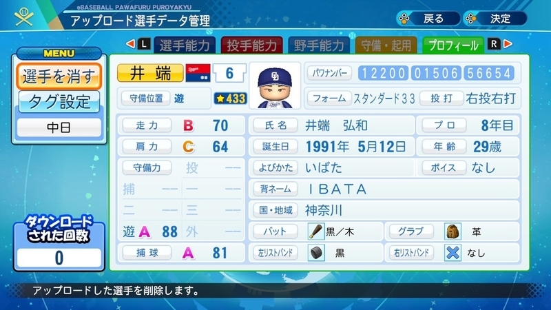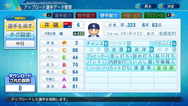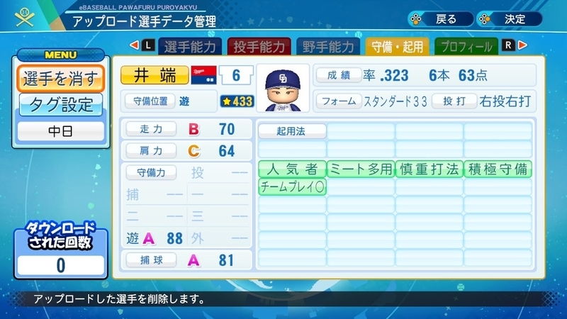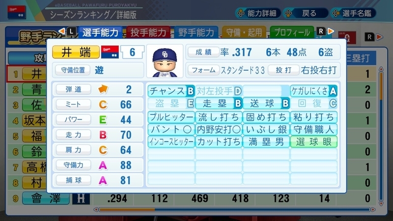 ミート多用、慎重打法ついてるので本当に時々ホームラン出る程度になってるはず、この兼ね合いでパワーは低めに設定してます